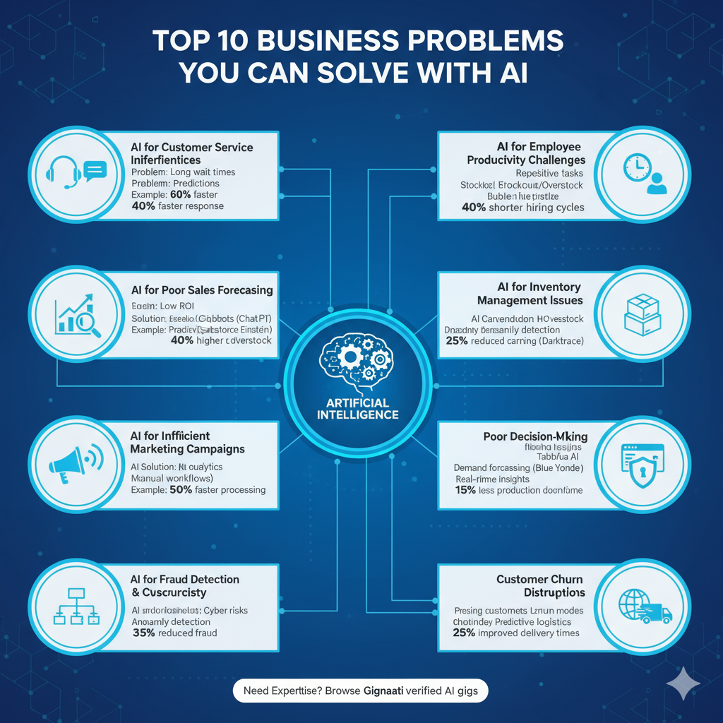 Whether you’re struggling with poor sales forecasting, high employee workload, or supply chain disruptions, there’s an AI-powered solution that can help. In this article, we’ll explore the top 10 business problems you can solve with AI, along with real-world examples of companies that turned challenges into growth opportunities using automation, predictive analytics, and intelligent decision-making tools.