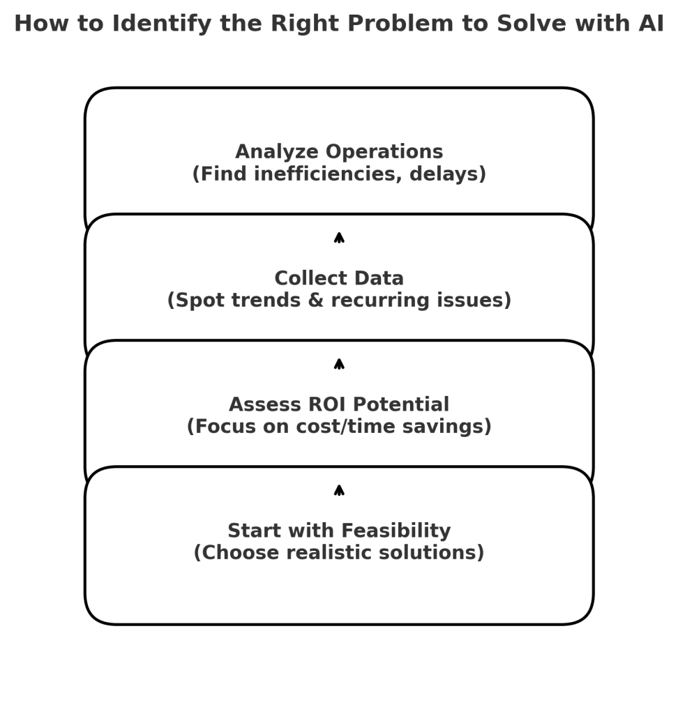 Before implementing AI, businesses should carefully choose where it adds the most value. Here’s how: