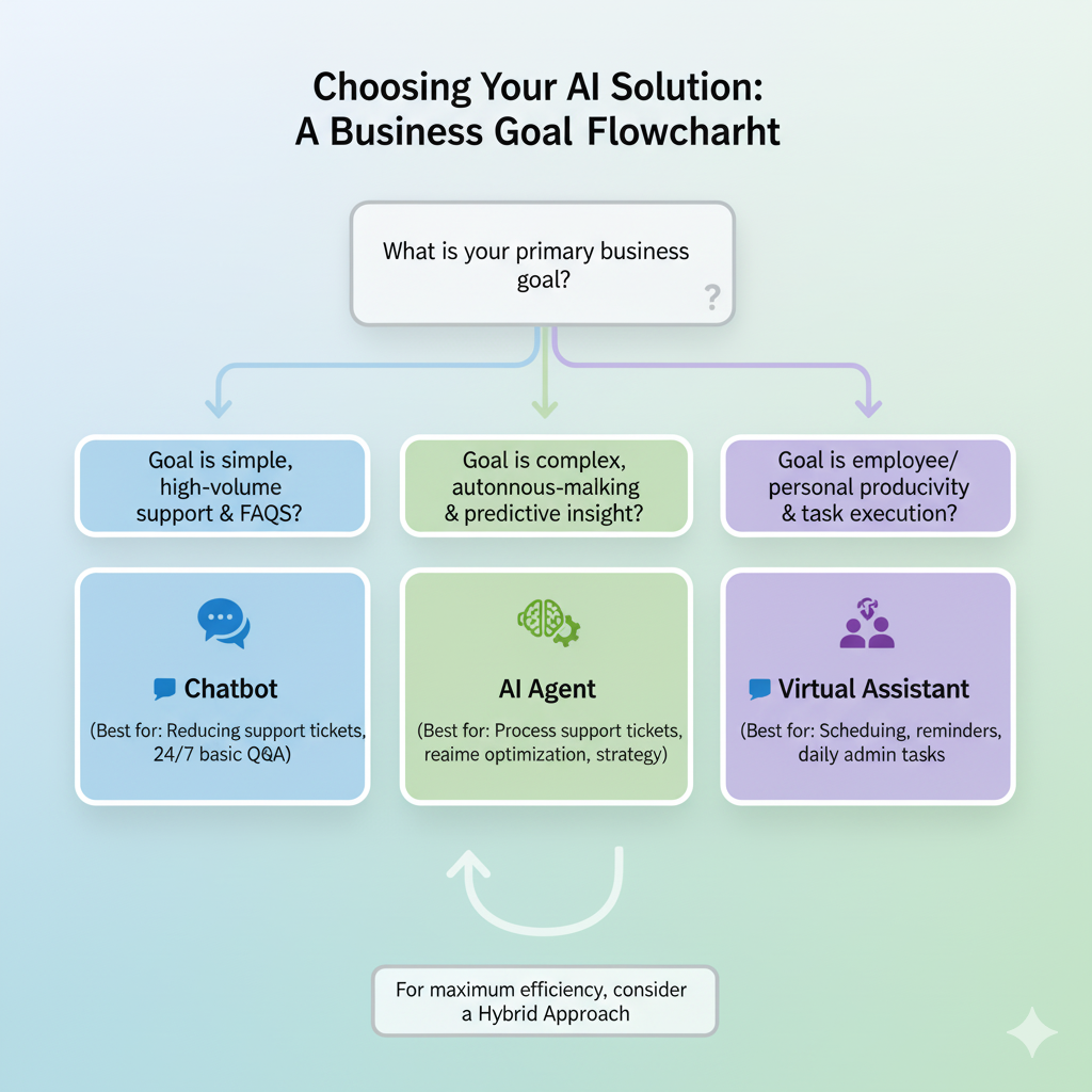 💡 Hybrid Approach: Many businesses combine them — chatbots handle customer FAQs, AI agents manage automation, and virtual assistants improve employee productivity.