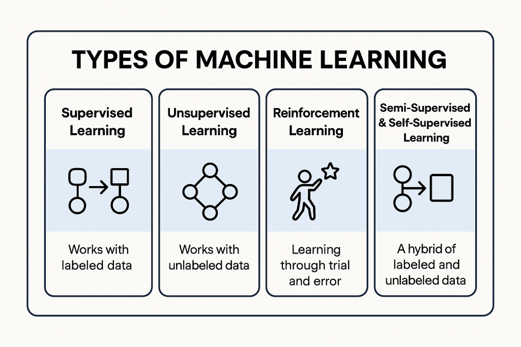 Semi-Supervised / Self-Supervised Learning – combines labeled and unlabeled data.