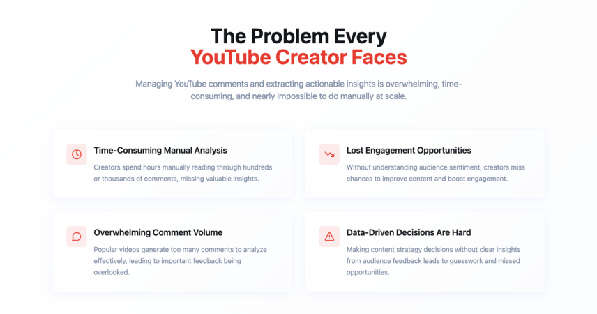 Β β Save hours of manual comment reading β Make data-driven content decisions β Improve video engagement and audience retention β Discover collaboration and community opportunities β Boost video visibility with keyword insights