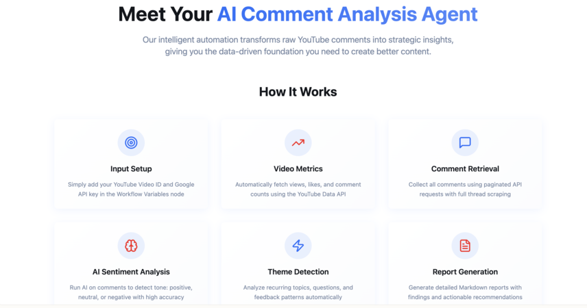 π Build Better Videos with Audience-Driven Insights This workflow lets creators turn raw comments into strategy. Discover what resonates, uncover improvement areas, and find your next viral topicβpowered by your viewers' words.