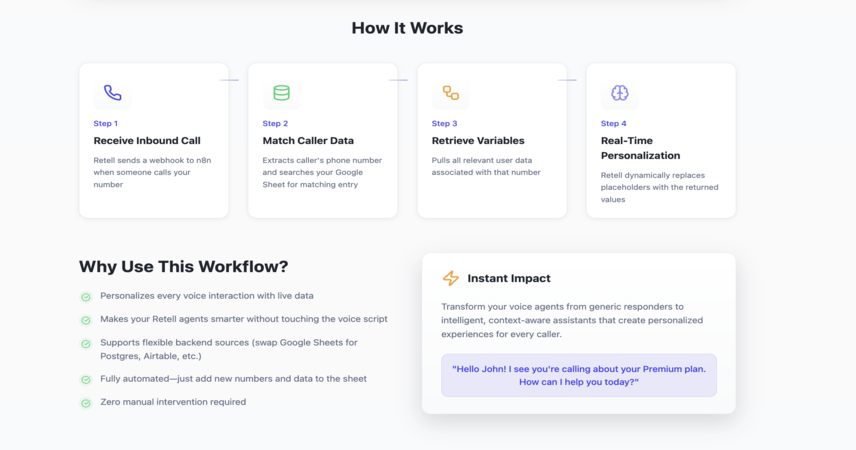 β π Receive Inbound Call Webhook β Retell sends a webhook to n8n when someone calls your number β π Match Caller β The workflow extracts the callerβs phone number and searches your Google Sheet for a matching entry β π Retrieve Variables β Pulls all relevant user data associated with that number β π§ Format & Respond β Formats the data into key-value pairs and returns them to Retell to populate the dynamic variables β π¬ Real-Time Personalization β Retell dynamically replaces placeholders in prompts (like {{first_name}}) with the returned values